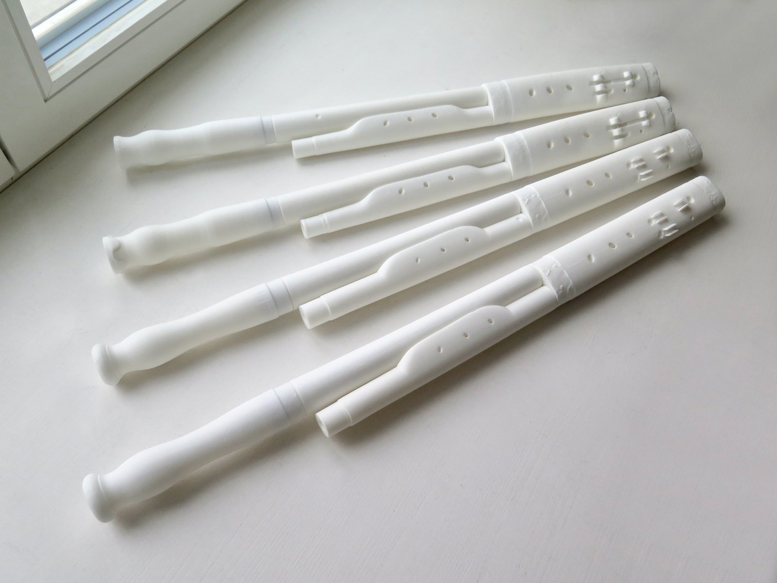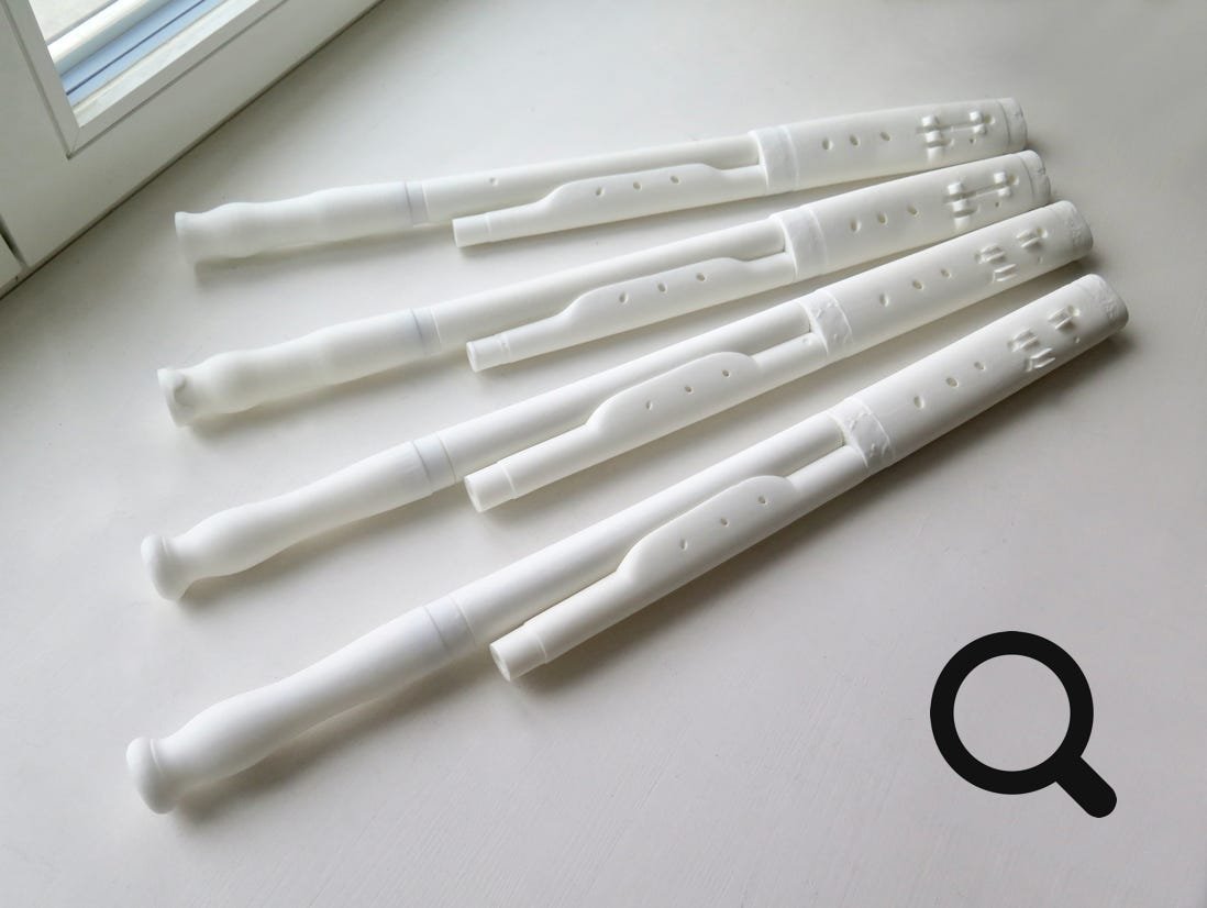The chosen material for the 3D-printed copies is SLS nylon, which has a slightly higher density than the original wood of the instruments but is very reliable, has a wooden-like inner structure, and has already been used for other woodwind instruments with great success. Nevertheless, once a 3D-model is produced, it is possible to 3D-print it again in other materials and compare the results. I very much look forward to bio-materials 3D-printers (including wood) which are currently being developed.