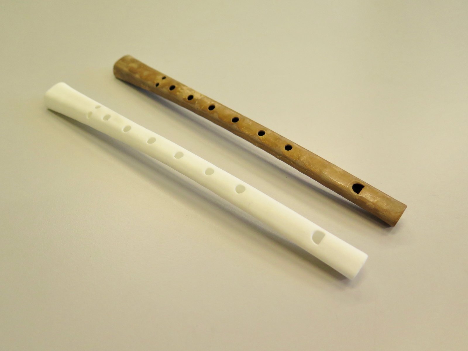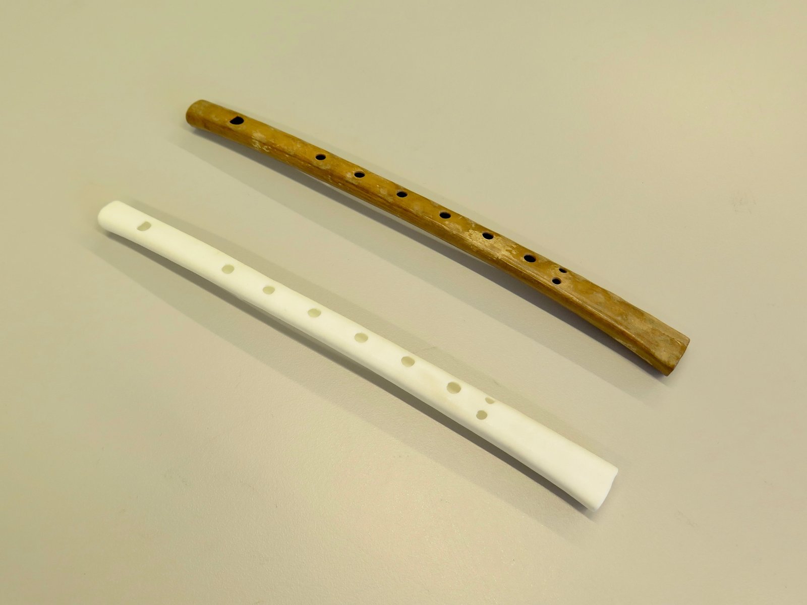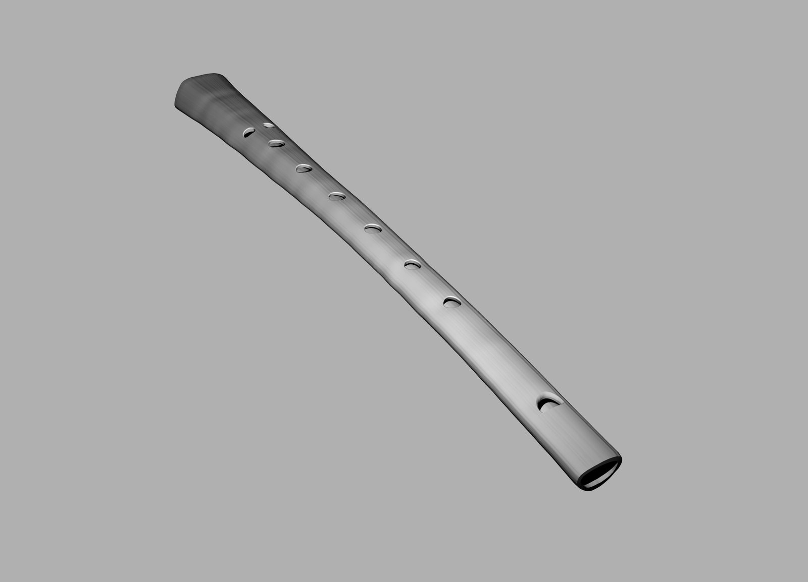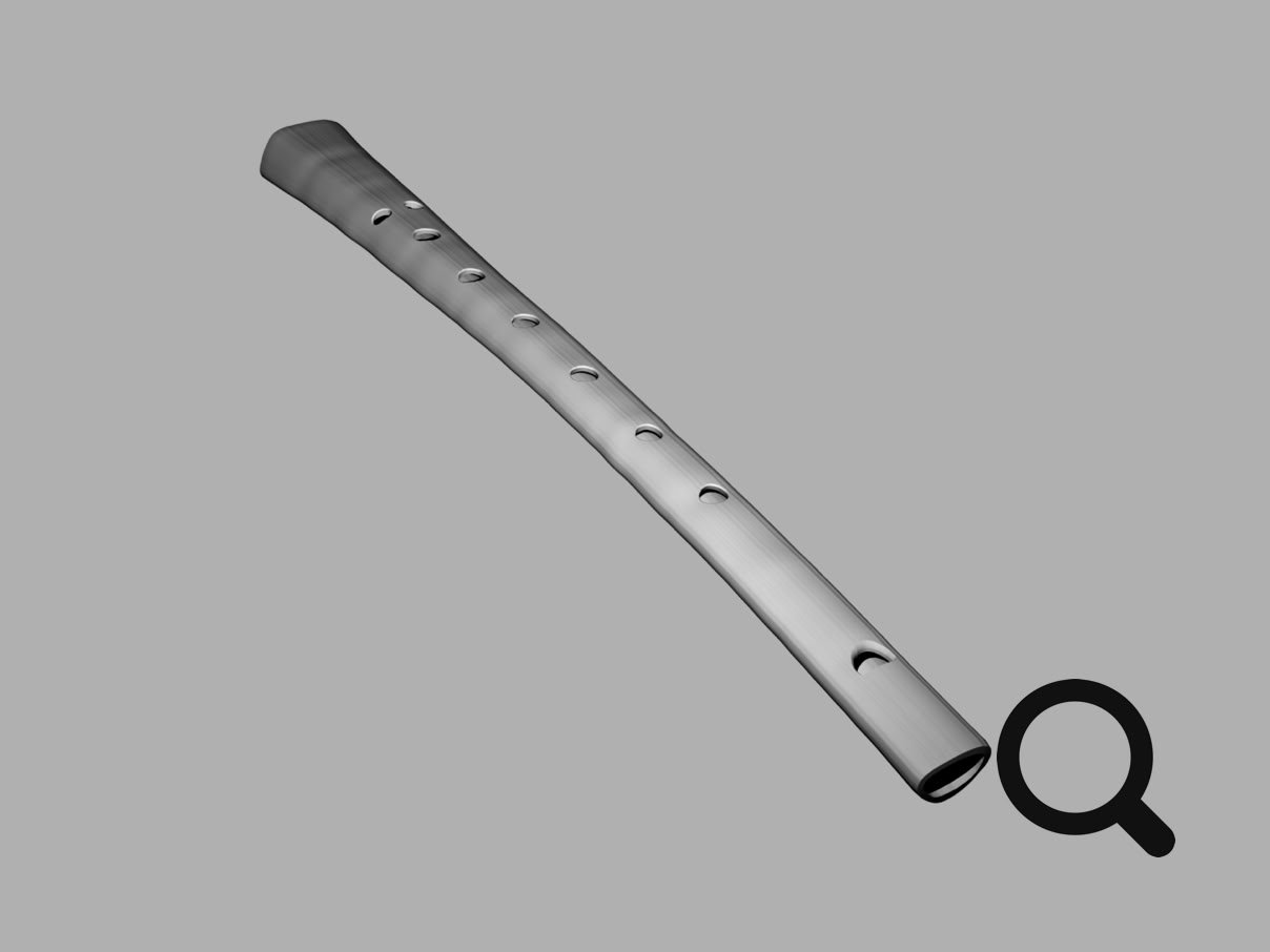 Alternative versions of the flute were also modeled, once without a labium (which allows for it to be played as a primitive whistle), once with a more delicate recorder-style labium and once with a traverse-style embouchure (which allows it to be played like a traverse).
