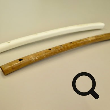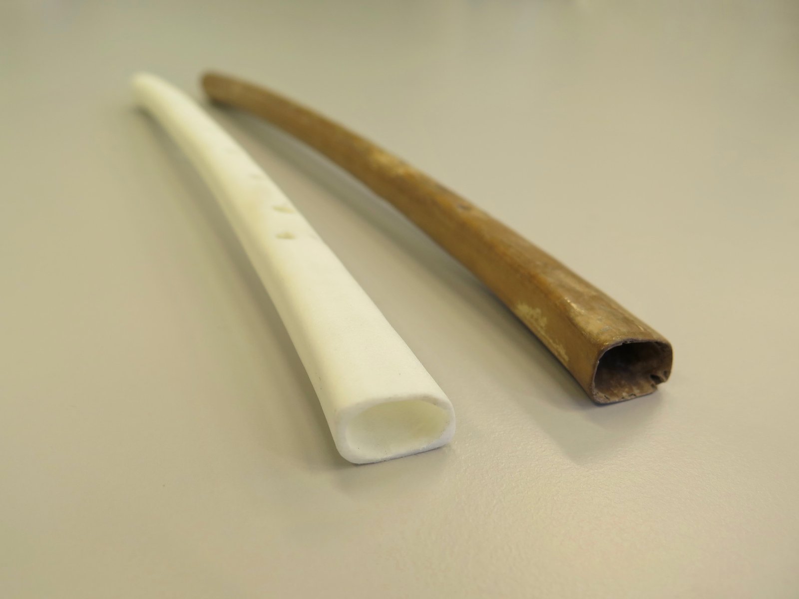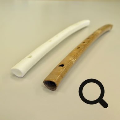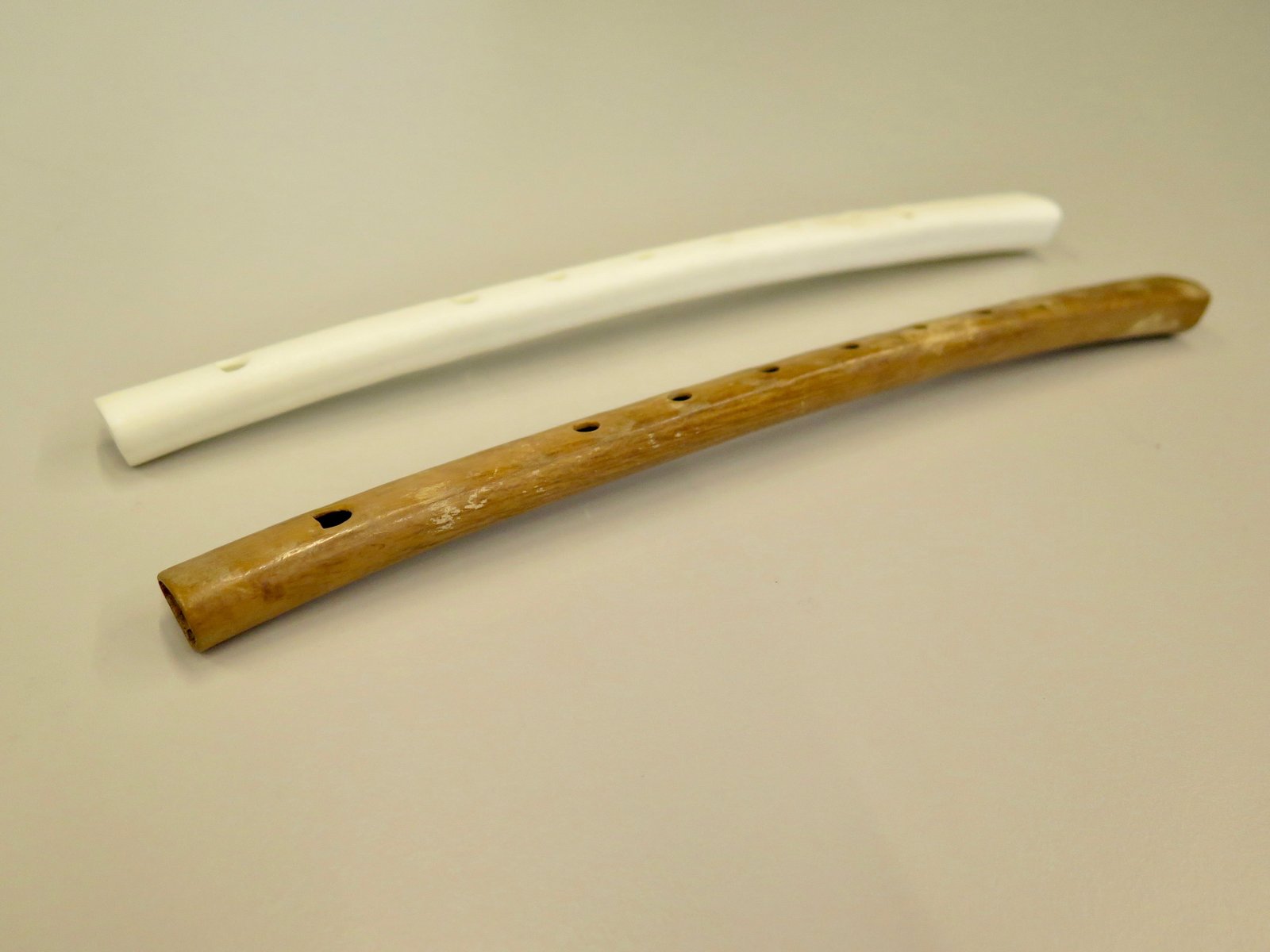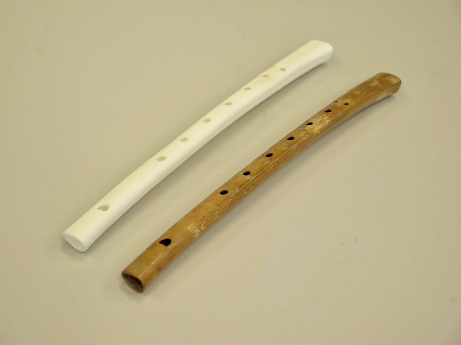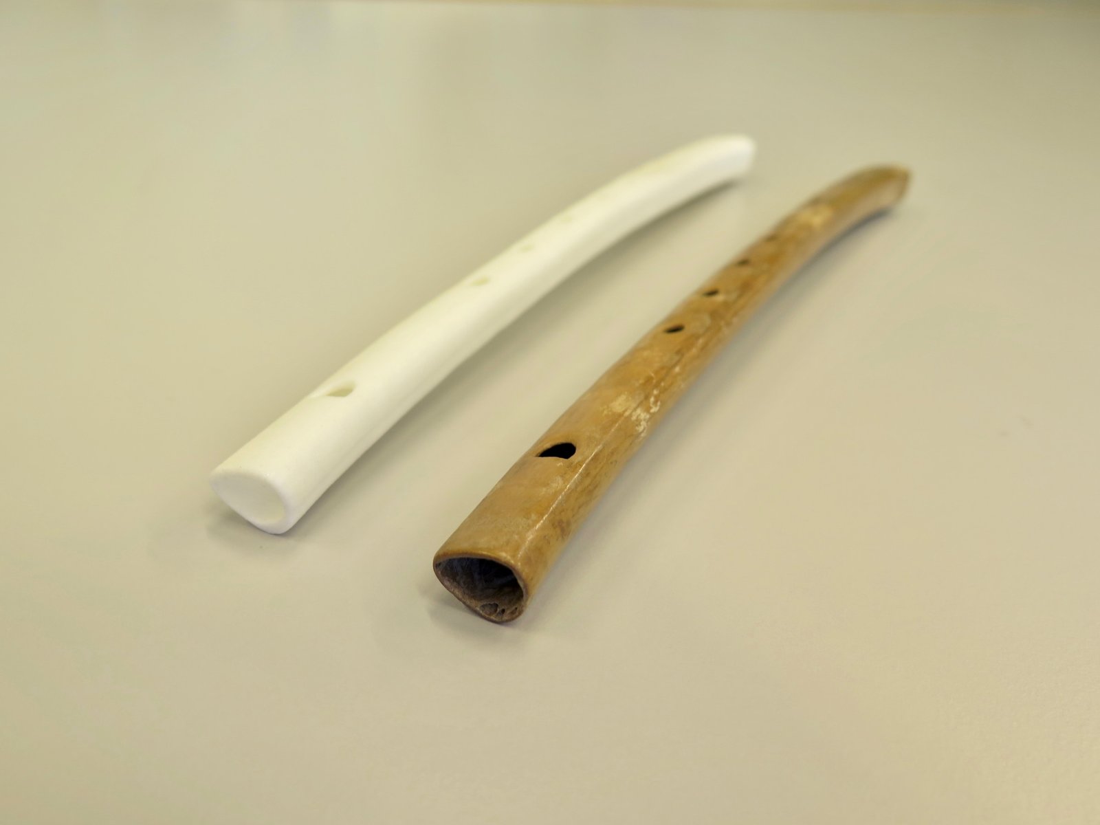 Alternative versions of the flute were also modeled, once without a labium (which allows for it to be played as a primitive whistle), once with a more delicate recorder-style labium and once with a traverse-style embouchure (which allows it to be played like a traverse).