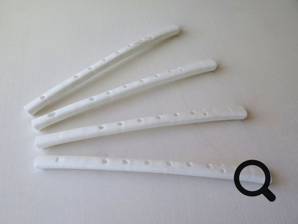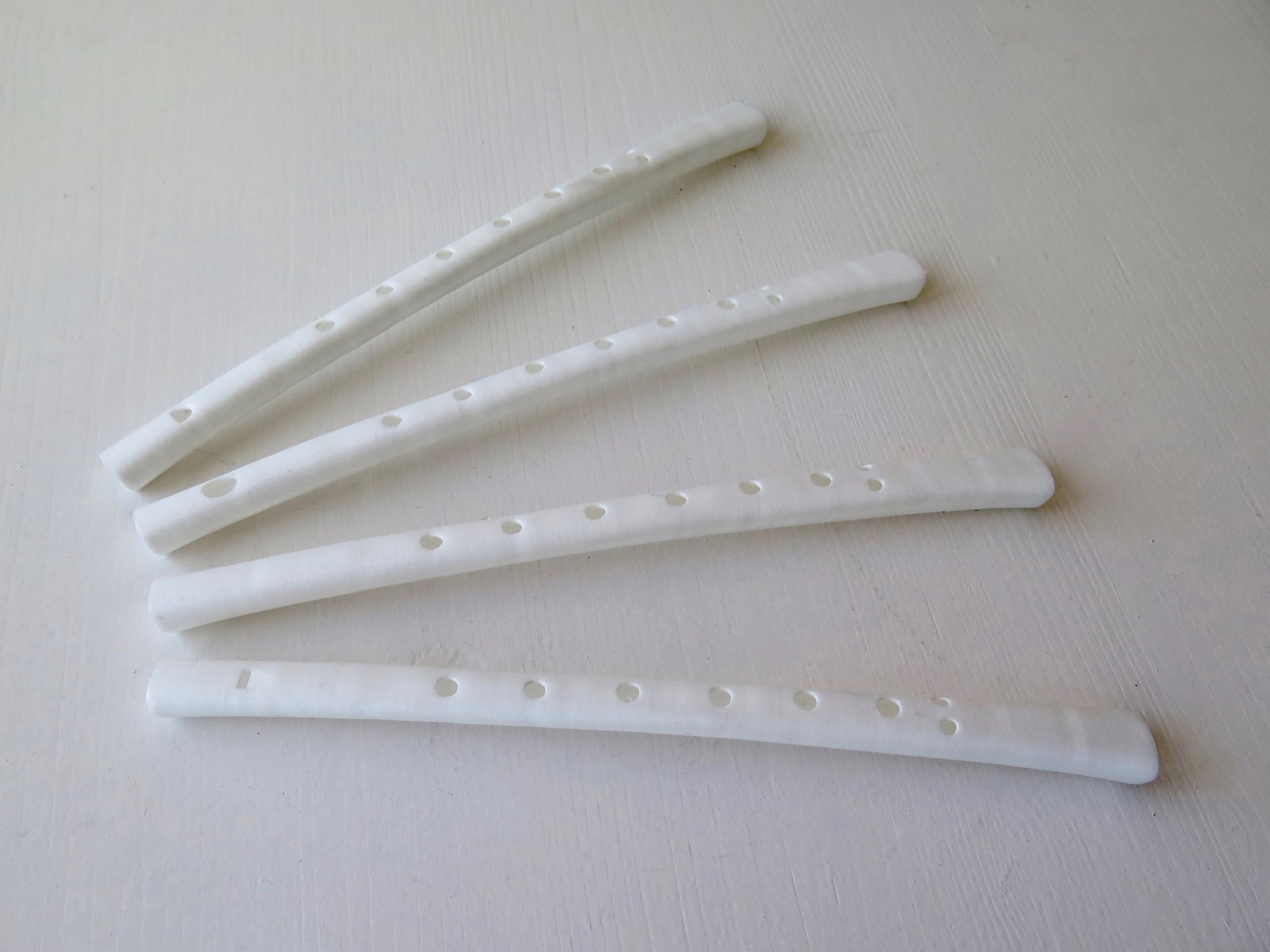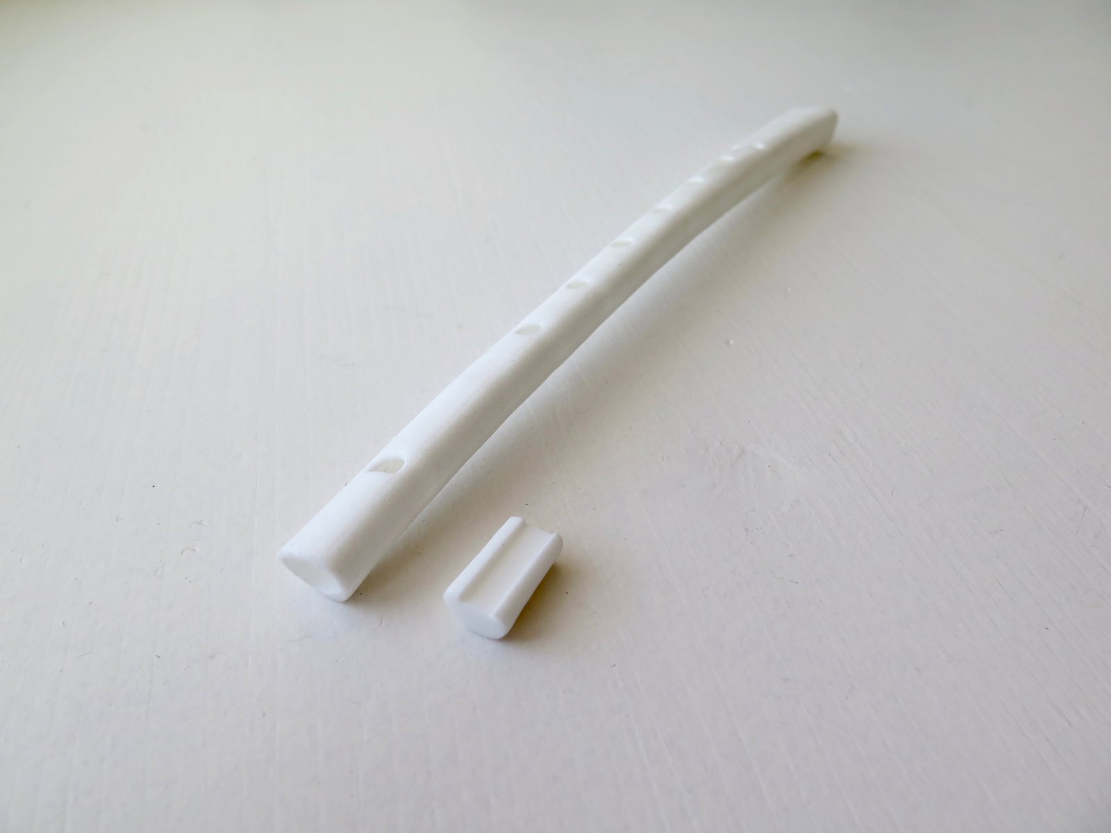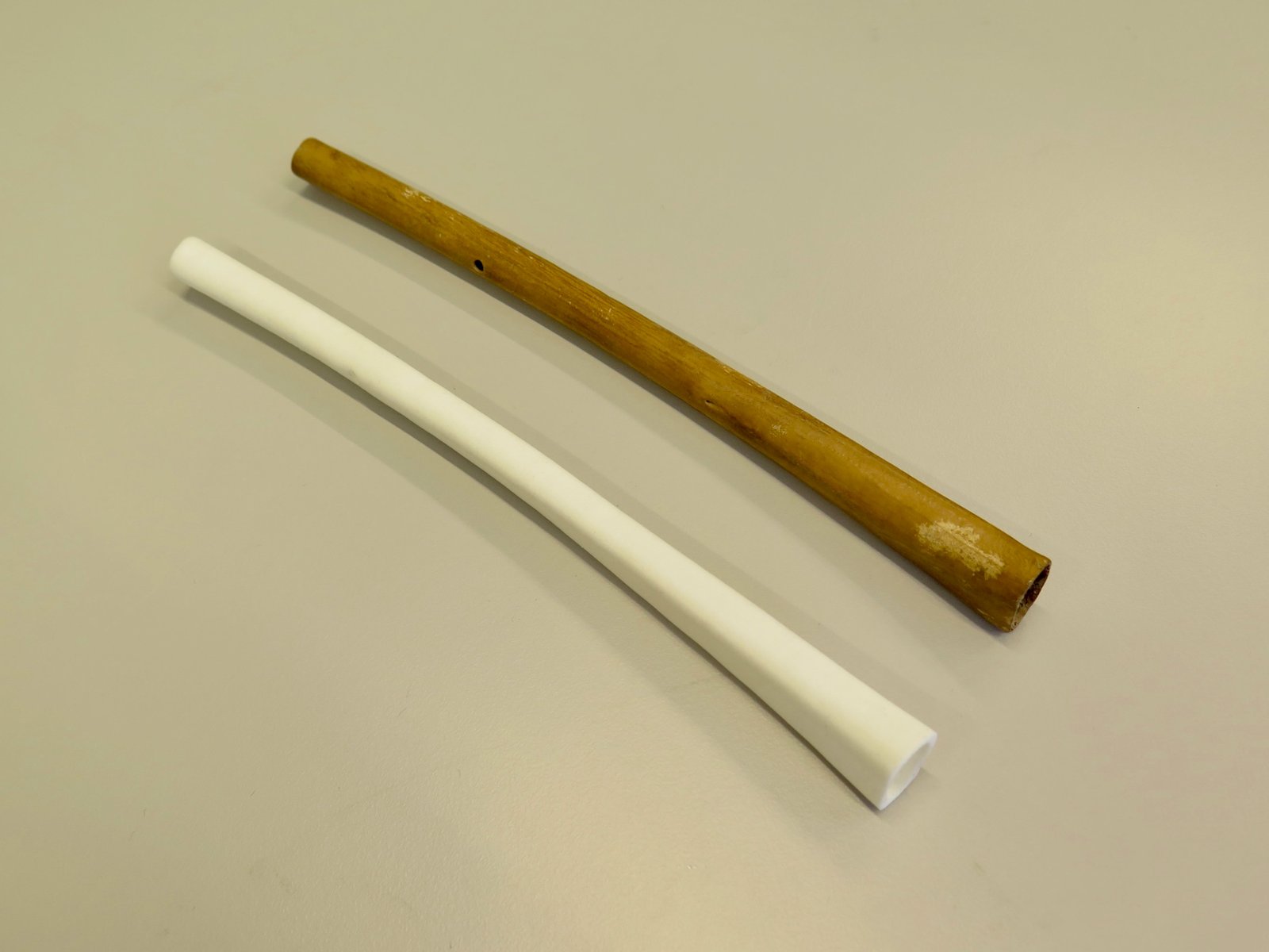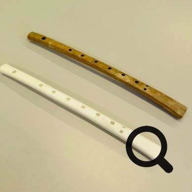 Alternative versions of the flute were also modeled, once without a labium (which allows for it to be played as a primitive whistle), once with a more delicate recorder-style labium and once with a traverse-style embouchure (which allows it to be played like a traverse).
